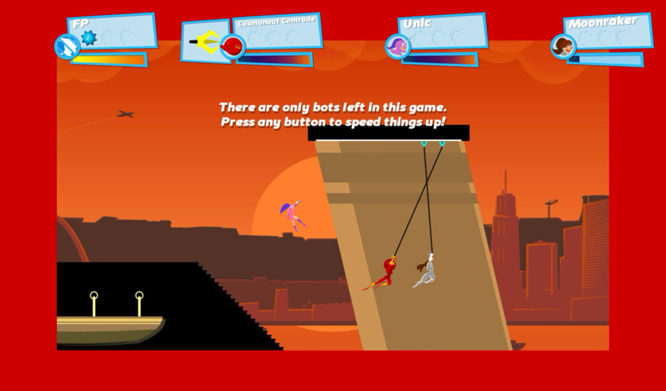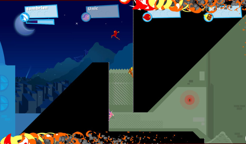 Or put them into matches with other people! Local and online multiplayer! Can you have 2 players on a couch against 2 other players on the internet? Yes of course! Bots enabled – play on your own with several AI opponents. Or put them into matches with other people! A tutorial teaches you how to play. Controller compatible (and recommended!) A dozen expertly designed maps. Unique game modifiers. A character named Unic! Full blown level editor with over 10k user created levels. An exciting single player campaign. Create your own custom in-game trails (visible when you hit super-speed). SpeedRunners is a 4 player competitive platformer with grappling hooks, power-ups, and interactive environments. Run, jump, swing around, fire rockets, grapple onto people to knock them off screen. 4 Player Competitive Platforming! Keep up with the fastest player in-game, or fall offscreen and get eliminated! Use weapons like missiles, mines and grappling hooks to screw over your friends, and make new enemies!