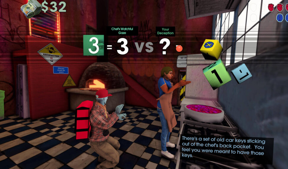 There are multiple ways to approach your mission, and eleven possible endings based on the choices you make along the way. Inspired by short, punchy, independent zine RPGs, this game evokes the feel of a one-off tabletop session, with Cosmo D as your guide. You show up to the club with seven skills: Athletics, Cooking, Deception, Music, Observation, Wisdom and Wit. These skills manifest as dice you’ll be rolling throughout your mission. In Club Low, you upgrade your skills by upgrading individual faces of your dice, then roll ’em live with real-time dice physics. Club Low is a deceptively dangerous place that rewards the curious, the bold and the whimsical. You can approach your mission in a myriad of ways, and depending on the choices you make, the outcomes of your mission are numerous. Care to discover all eleven endings? Sure, Betrayal At Club Low’s mission can be played in an evening, but it can also be replayed with new challenges and difficulty modes to uncover new layers of risk and reward.
