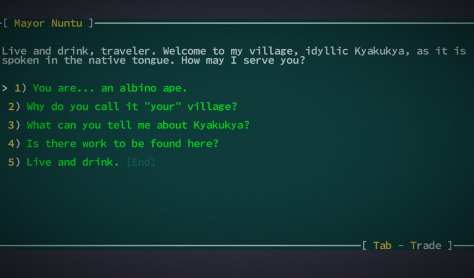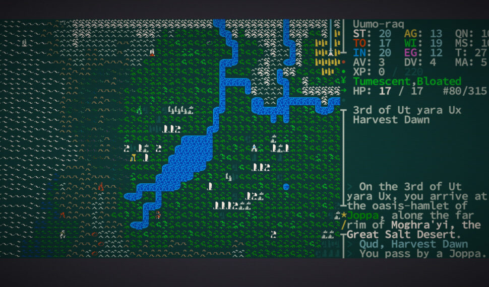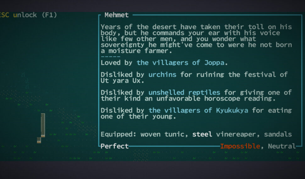 Play the role of a mutant indigenous to the salt-spangled dunes and jungles of Qud, or play a pure-strain descendant from one of the few remaining eco-domes—the toxic arboreta of Ekuemekiyye, the Holy City; the ice-sheathed arcology of Ibul; or the crustal mortars of Yawningmoon. You arrive at the oasis-hamlet of Joppa, along the far rim of Moghra’yi, the Great Salt Desert. All around you, moisture farmers tend to groves of viridian watervine. There are huts wrought from rock salt and brinestalk. On the horizon, Qud’s jungles strangle chrome steeples and rusted archways to the earth. Further and beyond, the fabled Spindle rises above the fray and pierces the cloud-ribboned sky. You clutch your rifle, or your vibroblade, or your tattered scroll, or your poisonous stinger, or your hypnotized goat. Not Tonight