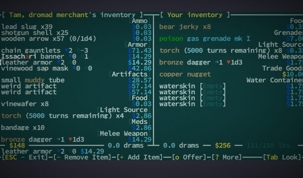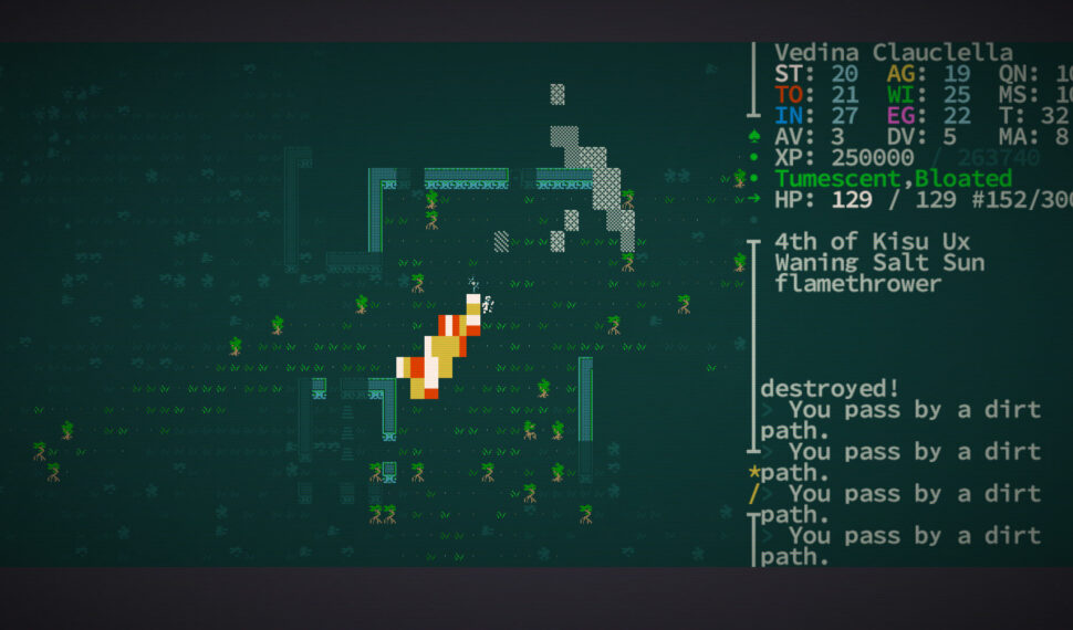 Assemble your character from over 70 mutations and defects and 24 castes and kits—outfit yourself with wings, two heads, quills, four arms, flaming hands, or the power to clone yourself—it’s all the character diversity you could want. Explore procedurally-generated regions with some familiar locations—each world is nearly 1 million maps large. Dig through everything—don’t like the wall blocking your way? Dig through it with a pickaxe, or eat through it with your corrosive gas mutation, or melt it to lava. Yes, every wall has a melting point. Hack the limbs off monsters—every monster and NPC is as fully simulated as the player. That means they have levels, skills, equipment, faction allegiances, and body parts. So if you have a mutation that lets you, say, psionically dominate a spider, you can traipse through the world as a spider, laying webs and eating things.