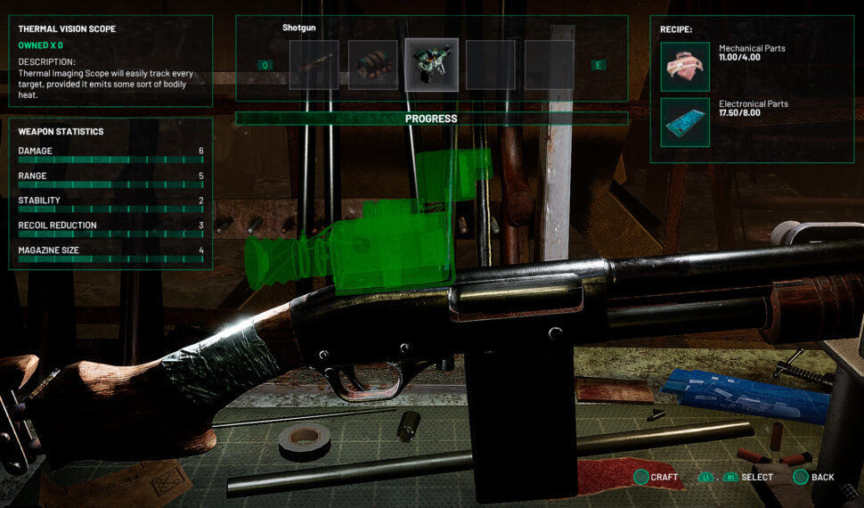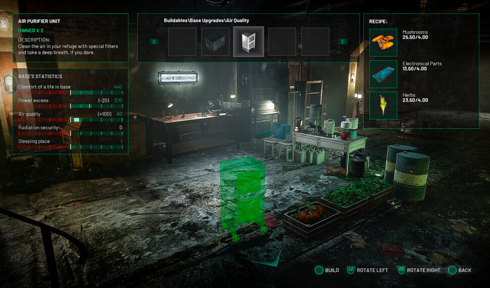 - Crafting. You decide: take care only of your basic needs or expand your possibilities by making weapon modifications, using tools and constructing advanced devices in your base.
