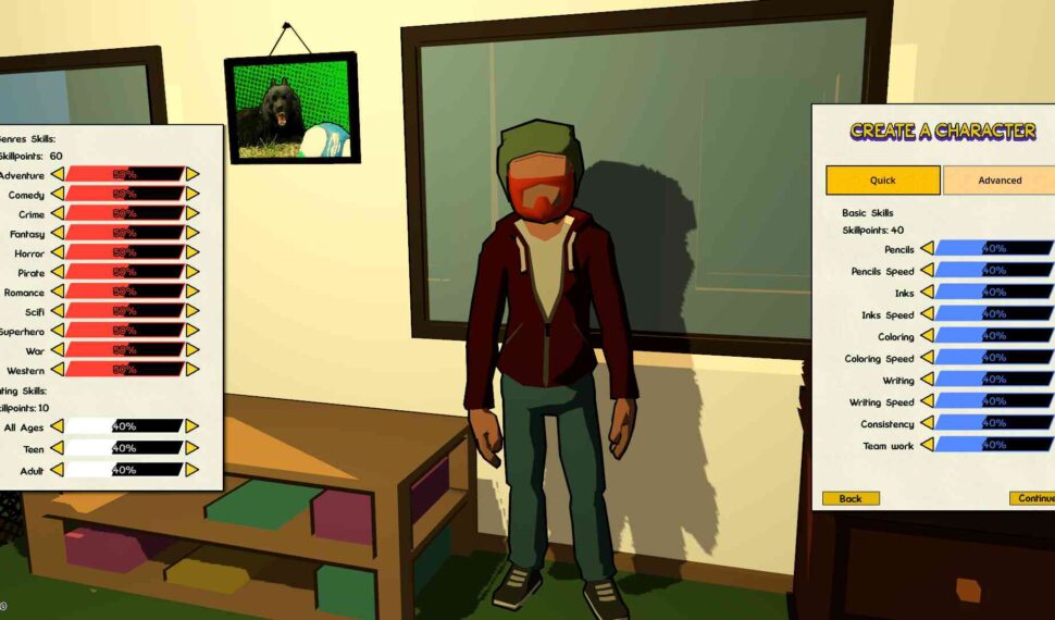 There more ways to adjust them but the game also allows you to leave it up to the creators if you don’t want to go that deep. To make comics your workers need work stations. To keep them happy you need to decorate the rooms too. Add some nice furniture so they can take a break. Paint the walls the colors you like. Keep your workers happy or they will quit. Make sure they like their team-mates or the work will suffer. Market in the game is dynamic with readers changing tastes and AI companies creating their own comics. You are directly competing with other companies for sales as each reader is simulated and they will only buy a set amount of comics.