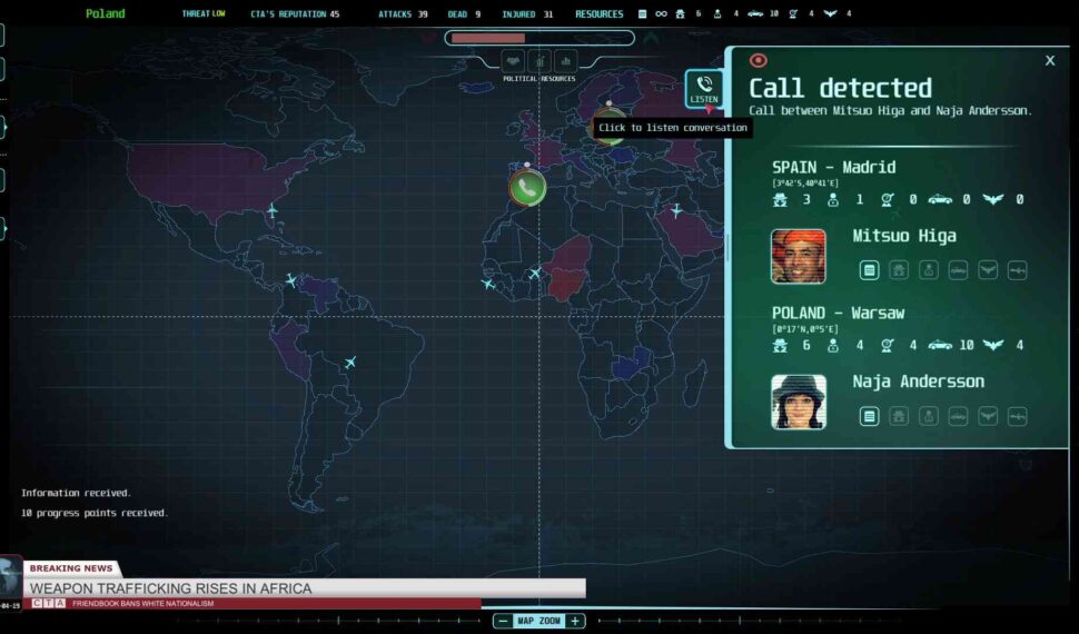 Use modern invigilation techniques, gather information, search for important members of terrorist networks and prevent devastating attacks. Decide who should be spied on and who should be neutralized. Discover Islamic World Caliphate cells all over the world. Fight far-right terrorism in United States and Europe. Uncover hidden truth about dangerous sects planning to take over the world. Some of decisions will be tough, but you have to act surely and quickly. Terrorism never sleeps…