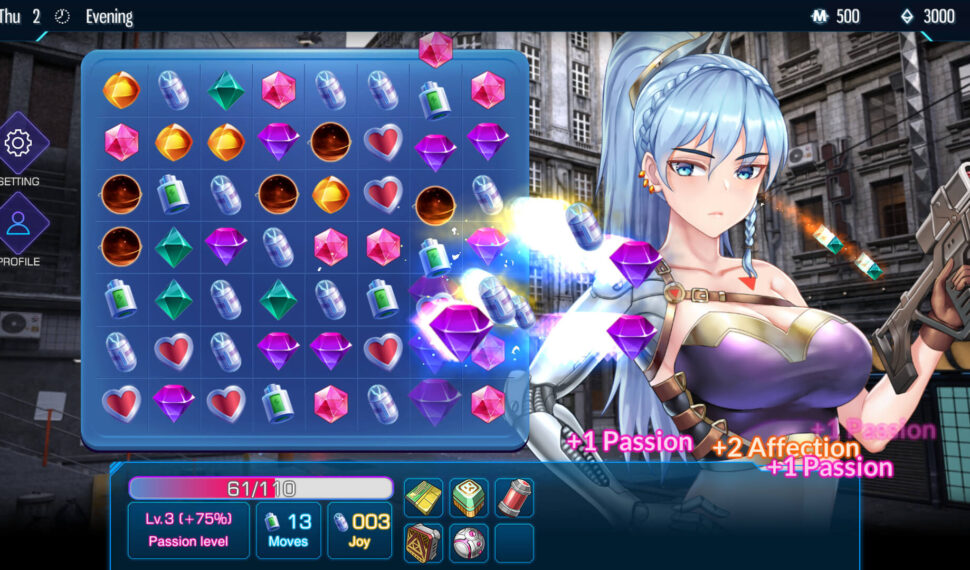 HuniePop-like match 3 puzzle game with indirect matching mechanic (freely to move token in column and row). This inspires her to leave the island and venture out to the royal capital, Ashra-am Baird. However, Ryza is unaware that this will lead to the beginning of an imaginative new adventure involving a pursuit of the mysteries of the ruins surrounding the royal capital and a meeting with a strange creature that will change her life.