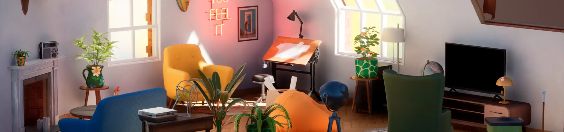 Wrap yourself in a cozy atmosphere where every small action and detail matters. Open a window to let the wind play with floating dust and bring nature’s sounds closer. Light candles, arrange books on shelves, paint a portrait on the wall, or switch on a projector. Everything you touch and every choice you make delivers a sense of satisfaction and a gentle “aha!” moment.