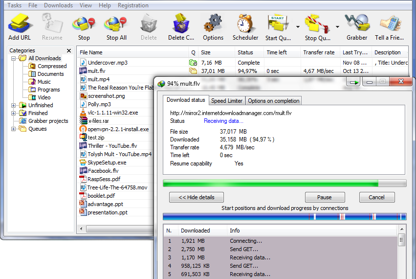 Internet Download Manager supports proxy servers, ftp and http protocols, firewalls, redirects, cookies, authorization, audio and video content processing. IDM integrates seamlessly into Microsoft Internet Explorer, Netscape, MSN Explorer, AOL, Opera, Mozilla, Mozilla Firefox, Mozilla Firebird, Avant Browser, MyIE2, and all other popular browsers to automatically handle your downloads. You can also drag and drop files, or use Internet Download Manager from command line. Internet Download Manager can dial your modem at the set time, download the files you want, then hang up or even shut down your computer when it’s done.