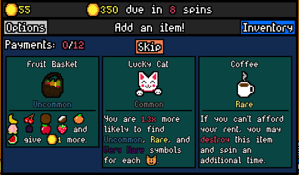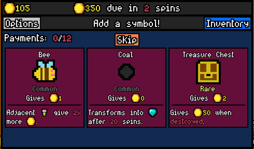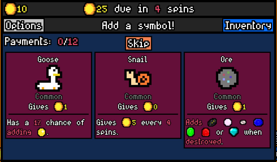 - Roguelite gameplay – The symbols you can add to the slot machine are different every time!