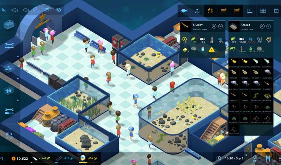As aquarium curator you’ll need to master creativity and economics to succeed. Keep your guests happy by providing them with seating, food, drinks and toilet facilities. Then at the end of their visit, direct them through the gift shop to boost your profits! Start your career in the campaign mode where you’ll learn everything you need to know about designing and managing an aquarium. Each of the 10 levels challenges you to build an aquarium with unique gameplay conditions and objectives, while new features and concepts are explained along the way. Next explore sandbox mode where, with customisable settings and a random challenge generator, you can find virtually unlimited fish-related gameplay! Running an inefficient aquarium is easy. To really thrive and take on the greatest challenges you’ll need a lateral thinking brain and attention to detail.