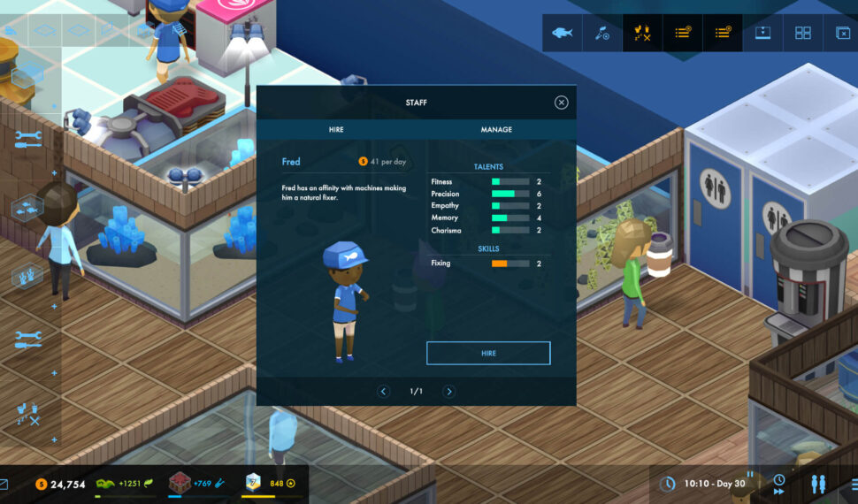 Starting with just a few tanks and the most basic of livestock, you’ll grow your aquarium to a thronging metropolis filled with hundreds of guests, tens of staff and a multitude of different aquatic lifeforms, each with their own unique care requirements. Megaquarium features almost 100 different marine species including fish, sharks, crustaceans, corals, jellyfish, other invertebrates and even a turtle! You’ll be spoilt for choice as you design, decorate and populate your tanks. You won’t get far without the right staff. Choose who to hire based on their skills and future potential. Will you train up a team of multi-disciplined staff or a set of super-focussed experts? You’ll have to weigh up the pros and cons of each strategy and work out what is right for your aquarium. Bayonetta
