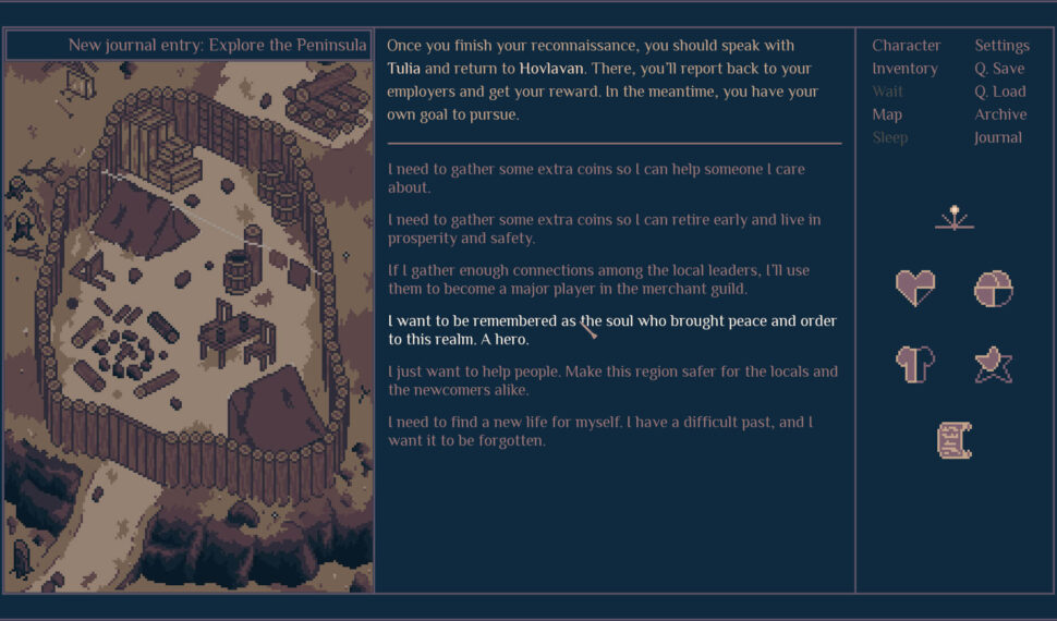 A powerful merchant guild has called on your services, sending you on a journey into the unknown planes of a mysterious peninsula in the hopes to expand the guild’s influence even further. Explore this world and gather as much information as possible to reveal the secrets surrounding the area. It’s a dangerous task, but an equally respectable one. Roadwarden is an illustrated text-based RPG that uses isometric pixel art and combines mechanics borrowed from RPGs, Visual Novels, adventure games, and interactive fiction, such as inventory puzzles, dialogue choices, character abilities and progression, hit points. simple survival mechanics. or quests restricted by in-game time.